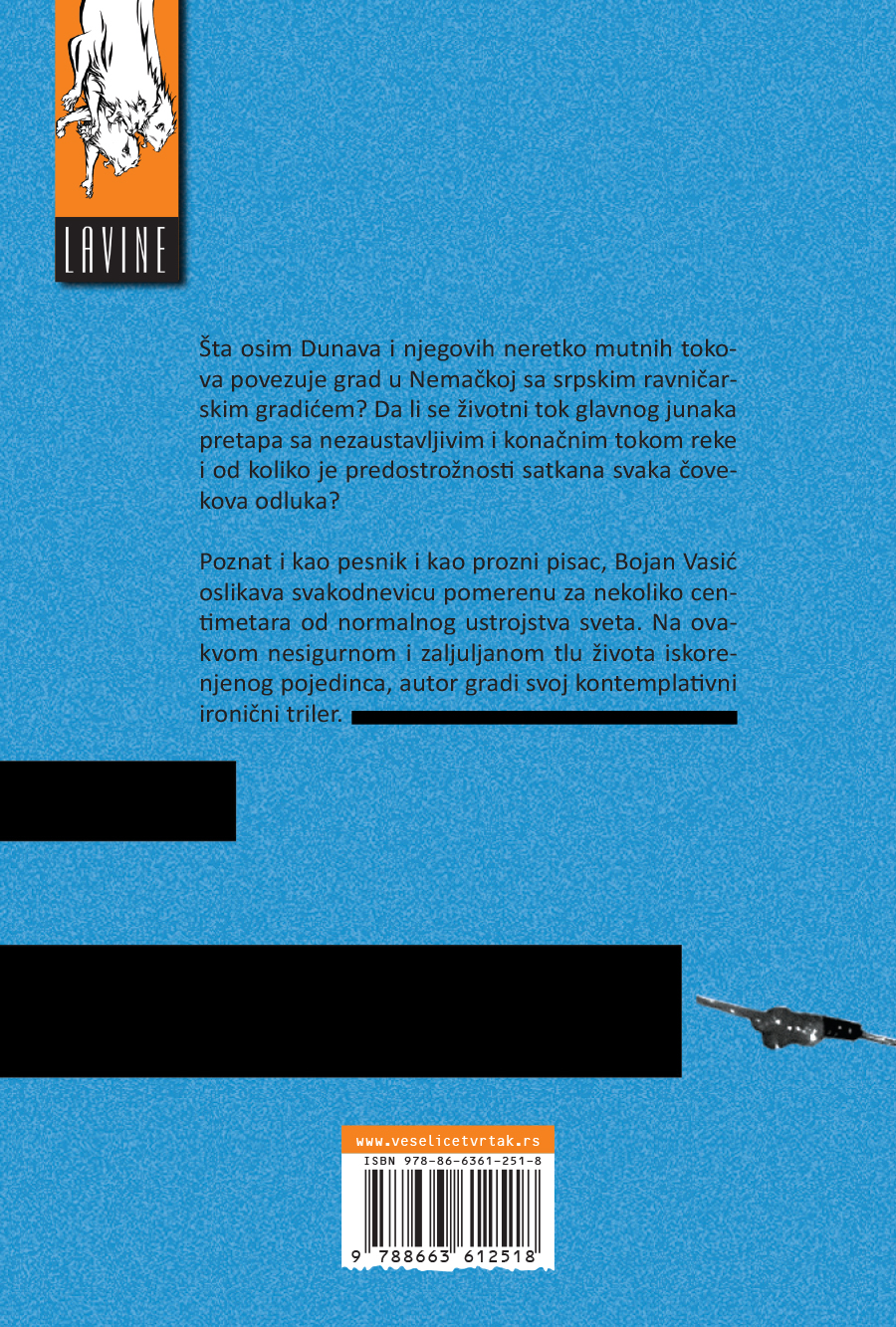 Šta osim Dunava i njegovih neretko mutnih tokova povezuje grad u Nemačkoj sa srpskim ravničarskim gradićem? Da li se životni tok glavnog junaka pretapa sa nezaustavljivim i konačnim tokom reke i od koliko je predostrožnosti satkana svaka čovekova odluka? Poznat i kao pesnik i kao prozni pisac, Bojan Vasić oslikava svakodnevicu pomerenu za nekoliko centimetara od normalnog ustrojstva sveta. Na ovakvom nesigurnom i zaljuljanom tlu života iskorenjenog pojedinca, autor gradi svoj kontemplativni ironični triler.